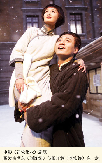 有人說,無論看《建國大業(yè)》還是《建黨偉業(yè)》,最大的興趣就是去看明星。我覺得這很好,既然在文化多樣化的時(shí)代眾口難調(diào),那就充分體諒“蘿卜青菜,各有所愛”的群眾情結(jié),觀眾愿意沖著誰去都行,哪怕是閑著沒事兒從影院路過,心中一動(dòng),進(jìn)去看場(chǎng)電影也行。《建國大業(yè)》上映后就是這樣,許多人原本只為了看明星,后來發(fā)現(xiàn)電影里還有好多其他東西,能讓人回味,能讓人溫故知新。觀眾們只要有了這種感受,就挺好。現(xiàn)在的《建黨偉業(yè)》從細(xì)節(jié)方面我們處理得更加面面俱到,更加吸引觀眾。有一段毛澤東和楊開慧的戲,劇組的女孩子看過以后說很浪漫。我們用現(xiàn)在的審美觀重塑了100年前的浪漫感覺,這樣更容易讓觀眾接受。