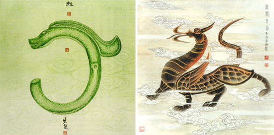 上圖右:飛龍在天(據漢畫像石獸身龍繪) 翟承海
