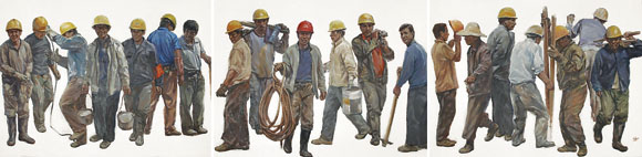 面對(duì)湖北美術(shù)館展廳中一幅幅充滿(mǎn)鮮活氣息的工地寫(xiě)生,不少觀展的農(nóng)民工流下了眼淚。展出的最大的一幅作品長(zhǎng)8米、寬1.5米,20余名形態(tài)各異、個(gè)性鮮明的農(nóng)民工形象躍然而出。有的疲憊地摘下安全帽;有的肩扛鋼材正面走來(lái);有的手背身后,似乎在思考;有的行色匆匆……他們?cè)诳灼娴漠?huà)里重新組合,互相呼應(yīng),動(dòng)感十足,構(gòu)成一幅具有完整感的肖像畫(huà)。