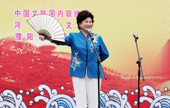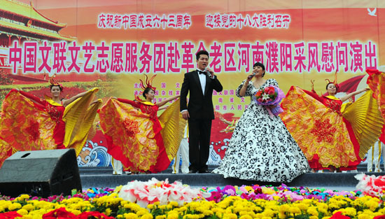 為慶祝新中國成立63周年、喜迎黨的十八大勝利召開,中國文聯主辦,中國雜協、中國文聯國內聯絡部、河南省委宣傳部、河南省文聯、濮陽市委市政府承辦了此次中國文聯文藝志愿服務團赴革命老區河南濮陽采風慰問演出活動。中國文聯黨組副書記、副主席李屹在活動上的致辭中表示,在河南濮陽舉辦這次采風慰問演出活動,就是要把黨和政府的親切關懷、把廣大文藝工作者的深情厚誼送給革命老區的父老鄉親們,讓大家共享文化發展的成果、共慶共和國的生日、共迎十八大的勝利召開。為貫徹落實黨的十七屆六中全會精神,中國文聯成立了中國文聯文藝志愿服務團。此次活動就是文藝工作者到人民中、到生活中、到實踐中去,志愿為人民群眾服務的具體行動,就是文藝工作者積極踐行“愛國、為民、崇德、尚藝”的文藝界核心價值觀的一次教育實踐活動。