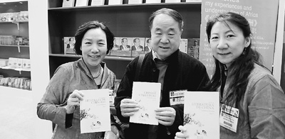 2012年倫敦書展期間,莫言在中國外文局展臺前手持《中國文學》與該系列圖書的編輯合影