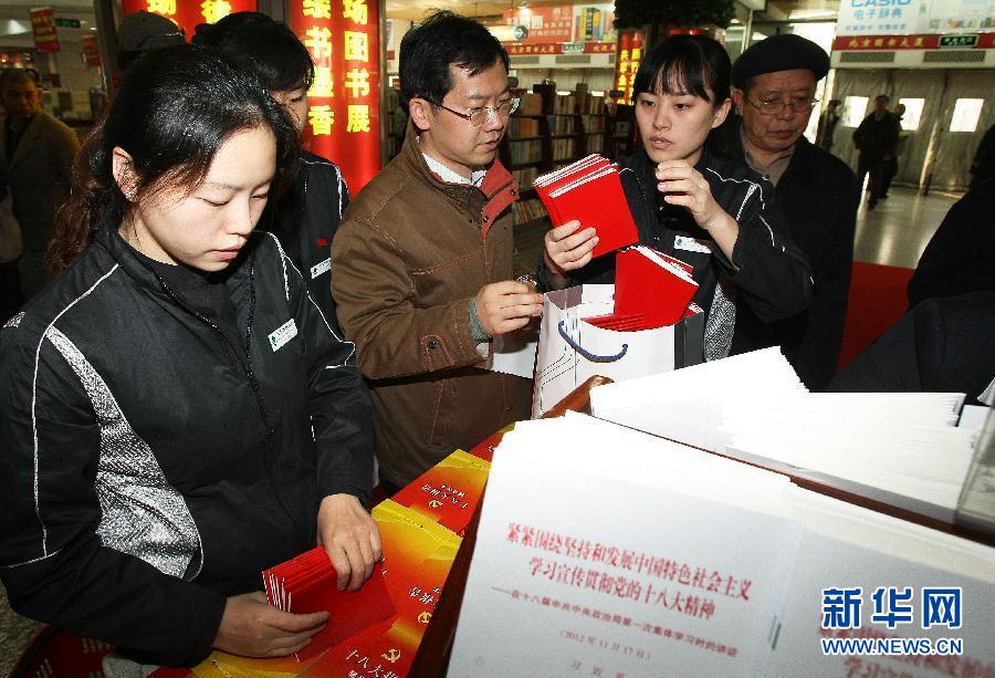 11月21日,工作人員在幫助讀者(中)整理購買的黨的十八大文件及學習輔導讀物。當日,由人民出版社出版的黨的十八大文件及學習輔導讀物首發式在北京圖書大廈舉行。 新華社發(李方宇 攝)