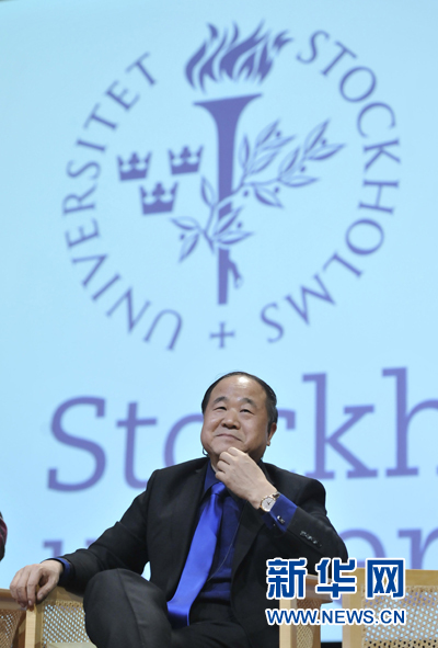 12月9日,2012年諾貝爾文學獎得主、中國作家莫言在瑞典首都斯德哥爾摩的斯德哥爾摩大學舉行文學講座。 新華社記者武巍攝