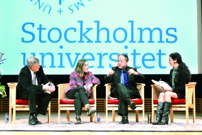 12月9日,2012年諾貝爾文學(xué)獎(jiǎng)得主、中國(guó)作家莫言(右二)在瑞典首都斯德哥爾摩的斯德哥爾摩大學(xué)舉行文學(xué)講座。 新華社記者 武巍攝