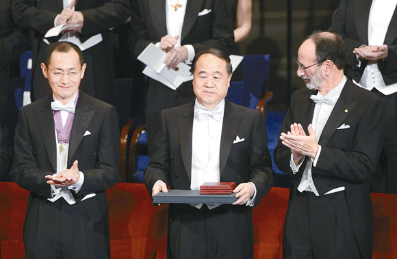 中國作家莫言(中)12月10日在瑞典首都斯德哥爾摩音樂廳獲頒2012年諾貝爾文學(xué)獎。