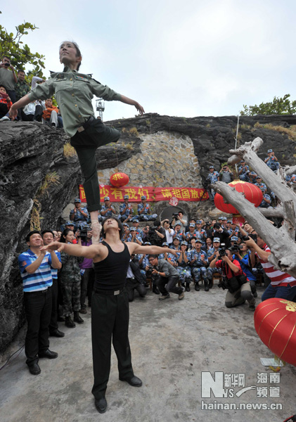 12月31日,雜技演員魏葆華(前下)和吳正丹(前上)在三沙市永興島為駐島官兵表演節目。