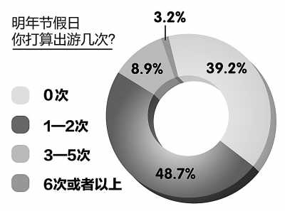 參與人民網強國論壇投票的網友中,六成人在2013年有旅游計劃。其中,近半(48.7%)計劃出游1—2次,8.9%計劃出游3—5次,打算出游6次以上的占3.2%。網友青山祠社區說:“2013年節假日,想多陪孩子游覽祖國的大好河山,紅色旅游勝地遵義、井岡山等。”