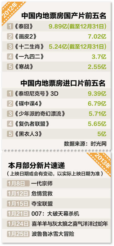 2013年1月,中國(guó)電影市場(chǎng)上將至少上映14部影片,其中不乏《一代宗師》、《007:大破天幕殺機(jī)》等頗具話題效應(yīng)的大片,而國(guó)產(chǎn)電影最新的票房紀(jì)錄也將在本月浮現(xiàn)。