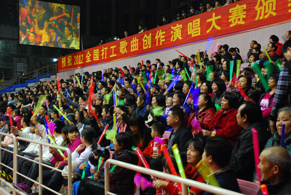 在中國地圖上,廣東東莞塘廈鎮(zhèn)并不是很起眼,但就是這個(gè)面積只有128平方公里、人口只有4.7萬人的小鎮(zhèn),卻擁有外資企業(yè)1200多家,民營企業(yè)3500多家,外來打工者近50萬人。“打工者”這個(gè)中國改革開放以來涌現(xiàn)的新群體,在這塊土地上得到最集中的體現(xiàn)。因此,1月11日在塘廈鎮(zhèn)體育館舉辦的“2012全國打工歌曲創(chuàng)作、演唱大賽頒獎(jiǎng)晚會(huì)”,便受到打工者的熱烈歡迎。現(xiàn)場觀眾揮舞著手中的熒光棒,歡聲雷動(dòng),向?yàn)樗麄儗懜璧脑~曲作者、為他們演唱的歌手致謝。