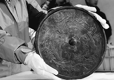 考古工作人員展示出土的唐代“鸚鵡銜綬帶銅鏡”。 新華社記者 任 瓏攝