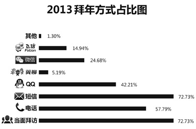 速途研究院關(guān)于拜年方式的調(diào)查顯示,選擇傳統(tǒng)的當(dāng)面拜訪方式和短信拜年的比例都超七成,電話、QQ也是拜年的重要選擇。不容小覷的是,有24.68%的被調(diào)查者選擇了微信作為自己的拜年方式。專家指出,這還只是個開始。