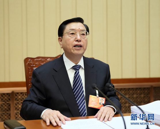 3月12日,十二屆全國人大一次會議主席團在北京人民大會堂舉行第三次會議。主席團常務主席張德江主持會議。 (新華社記者 蘭紅光 攝)