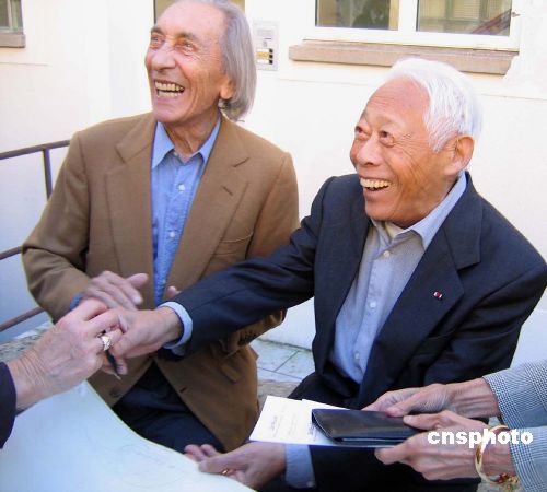 資料圖:法籍華人繪畫大師趙無極畫展2007年10月6日在法國勒莫爾市的博物館城堡開幕,展出趙無極60余件繪畫珍品,包括油畫和水墨作品,時間跨度長達60年。當日,來自四面八方的人群在城堡外排起長龍,爭相一睹這位東方藝術大師的風采。圖為趙無極在展覽現場。