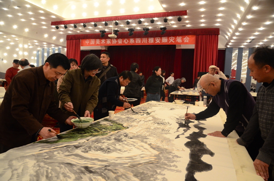 看著美術家現場的激情創作,看著他們用畫筆傳遞的一份份沉甸甸的愛心,中國美協分黨組書記、駐會副主席吳長江表示,雅安發生地震,牽動了全國人民的心弦。全國各族人民關注抗震第一線,舉國同心,緊急救援,充分展現出中華民族的凝聚力和向心力。美術家們也迅速行動起來。中國美協除了捐款外,積極組織賑災筆會,這么多老中青三代美術家積極參與,充分彰顯了美術界團結與健康的良好局面,體現了廣大美術家強烈的社會責任感和擔當意識。據吳長江介紹,中國美協還將在今年合適的時間,組織美術家到雅安采風創作,為雅安作畫,為重建謳歌。同時,中國美協還將開展對四川地震災區的基層美術工作者的培訓工作,將送文化與種文化相結合,在讓基層美術工作者共享當代美術發展繁榮成果的同時,也為地震災區人民的精神生活重建貢獻力量。(段澤林)