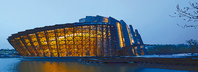 烏鎮原本并沒有大劇院。在3年時間內,烏鎮耗資4億元建成了大劇院(見右下圖)。大劇院占地面積5.4萬多平方米,與歷史悠久的江南水鄉小鎮相映成輝。