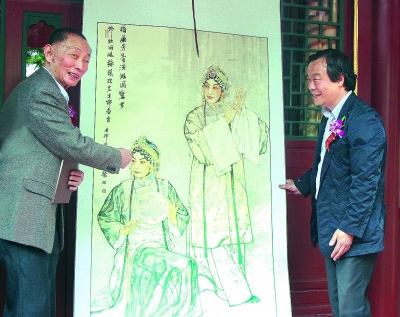 日前,著名京劇表演藝術(shù)家、京劇大師梅蘭芳之子梅葆玖先生獲聘擔(dān)任梅蘭芳紀(jì)念館榮譽(yù)館長。他動(dòng)情地說:“我當(dāng)年跟父親、母親在這個(gè)院子里生活,在這個(gè)院子里排戲、吊嗓子、練武功。如今,一個(gè)甲子都過去了,我現(xiàn)在都快八十歲了,我又站在這個(gè)院子里,往事歷歷在目。我能做的就是把我所會(huì)的藝術(shù)傳承給大家,為梅派藝術(shù)、為弘揚(yáng)中華民族的傳統(tǒng)文化和京劇流派藝術(shù),盡我應(yīng)盡的責(zé)任。”圖為梅葆玖在聘任儀式上與畫家韓學(xué)中一起欣賞韓學(xué)中根據(jù)梅蘭芳、梅葆玖同臺(tái)演出京劇《游園驚夢(mèng)》情景創(chuàng)作的國畫作品。