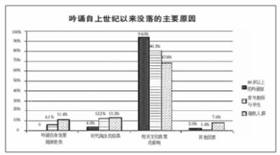 吟誦自上世紀初衰落的原因在于人為割裂而非自然淘汰。在我們調查訪問的三大群體中,對吟誦自上世紀以來沒落的主要原因,都不約而同地首選“相關文化政策的影響”(94%、80.3%、67.8%),而后分別是“時代淘汰的結果”(4%、12.2%、13.2%)、“吟誦自身發展規律使然”(0、6.1%、11.4%)和“其他因素”(2%、1.4%、7.6%)。選擇“其他因素”的受訪者也大都填寫諸如“傳統文化被拋棄的結果”、“政治變革和文化變革”、“新文化運動,專家們的誤導”、“人為割裂百年”等原因。尤為值得注意的是,在80歲以上的會吟誦的長者看來,吟誦藝術瀕臨滅絕,絕非吟誦自身發展規律使然,故無一人選擇此項。