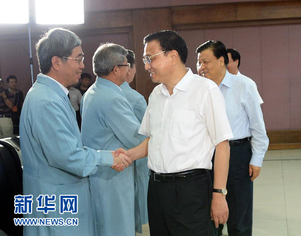 6月11日,中共中央政治局常委、國務院總理李克強,中共中央政治局常委、中央書記處書記劉云山在北京航天飛行控制中心觀看神舟十號飛船發射實況。這是神舟十號飛船發射成功后,李克強、劉云山與北京航天飛行控制中心的工作人員握手交談。 新華社記者 李濤 攝