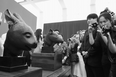 與會記者和嘉賓在捐贈儀式現場觀賞和拍攝兔首(左)和鼠首。新華社記者 李鑫攝