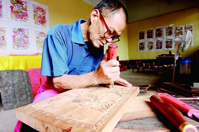 周口年畫(huà)傳承人夏明月在雕刻木版年畫(huà)模板。 CFP