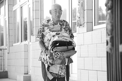 81歲的劉顯臣老人抱著戲服準備晾曬。(資料圖片)