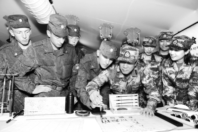 8月7日,在俄羅斯中部軍區切巴爾庫爾合同訓練場,中方官兵向俄方官兵介紹毛筆書寫漢字的方法。當天下午,參加“和平使命—2013”中俄聯合反恐軍事演習的俄方部分參演官兵參觀了中國傳統文化體驗館。體驗館設在切巴爾庫爾合同訓練場一處野戰兵營帳篷內,內有中國茶道、國畫、京劇臉譜、蛋雕、剪紙等八個文化展區,令俄方參演官兵大開眼界。 新華社發