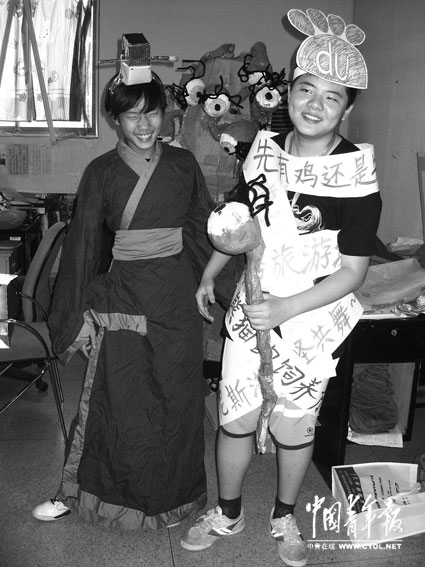 來自上海市延吉第二初級中學(xué)的學(xué)生在上臺前穿戴服裝準(zhǔn)備道具,他們的參賽題目叫“蒼耳的被動遷徙”。