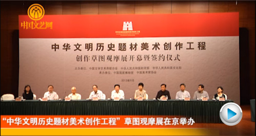 “中華文明歷史題材美術創作工程”經中宣部批準,由財政部、中國文聯、文化部聯合舉辦,中國美協具體承辦。計劃歷時5年,用繪畫、雕塑等視覺藝術形式來呈現煌煌五千年的歷史文明,集中創作一批具有藝術性、文獻性、民族史詩品格,氣勢恢宏、形式多樣、技藝精湛,能夠傳之久遠,并為人民大眾喜聞樂見的精品佳作。“工程”自2011年底正式啟動,主辦單位積極發動。2012年5月發布申報實施辦法, 7月下旬在四川召開創作動員大會,全國美術家熱情參與, 12月下旬進行了首輪草圖評審。2013年5月下旬進行了第二輪草圖評審,按程序確定了入選美術家,初步實現了預期目標和進展進度。中國文聯副主席、“工程”組委會副主任兼秘書長馮遠表示,這些作品草圖凝聚著所有參與創作的老中青美術家和創作指導委員會專家的藝術才華和心血智慧,也凝聚著主辦單位和實施單位領導專家的熱情指導幫助,“工程”草圖觀摩展的成功舉辦既是“工程”階段性展示匯報,也是專家作者共同觀摩交流評議的良好時機。“工程”目前已順利完成了預期目標,取得了階段性的重要成果。