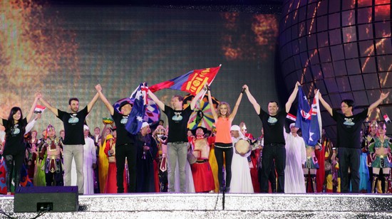 開幕展演中,來自五大洲的民間藝術家們同唱《友誼地久天長》 孟祥寧攝