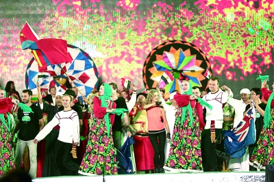 由美國猶他州立猶他山谷大學國標舞團表演的《美國西部土風舞》個性張揚奔放,青春靚麗的美國大學生,以歡快的步伐,時而跳起“牛仔”,時而扭起“拉丁”,上演著一場美國西部鄉村舞會。埃及轉裙舞,則全部由男人表演,舞者以左腳為圓心,呈逆時針方向不停地旋轉,舞者好似靜心冥思。隨后,洋溢著濃郁俄羅斯風情的歌曲《歡樂的早晨》、彰顯埃塞俄比亞人民熱情和勇敢個性的舞蹈《我的祖國》……一個又一個極具藝術性的節目相繼登臺,把整個展演推向高潮。