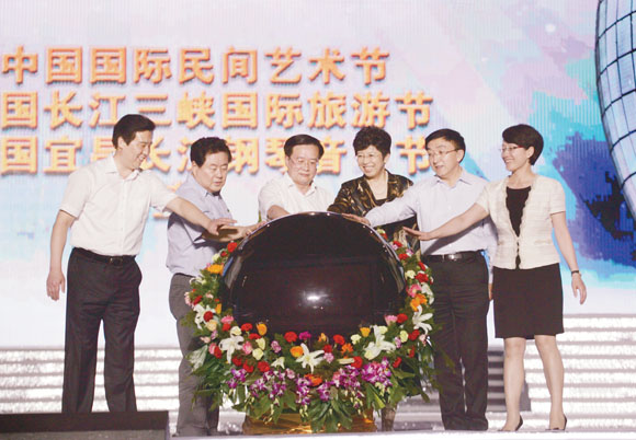 中國(guó)文聯(lián)黨組書記、副主席趙實(shí),國(guó)家旅游局黨組成員吳文學(xué),中國(guó)文聯(lián)副主席、中國(guó)音協(xié)分黨組書記、駐會(huì)副主席徐沛東,重慶市副市長(zhǎng)譚家玲,湖北省委副書記、省長(zhǎng)王國(guó)生,湖北省委常委、宜昌市委書記黃楚平登臺(tái)按動(dòng)水晶球啟動(dòng)開(kāi)幕式