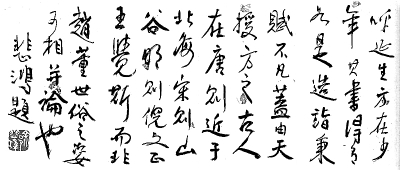 徐悲鴻對王學仲說:“‘怪’字的含義有貶也有褒,‘揚州八怪’不也是‘怪’嗎?你的書畫有一些文人畫的趣味,但還要下深功夫,形成你個人的風貌。”徐悲鴻揮毫勉勵他:“呼延生方在少年,其書得有如是造詣,秉(稟)賦不凡,蓋由天授,方之古人,在唐則近于北海,宋則山谷,明則倪文正、王覺斯,而非趙、董世俗之姿可相并論也。”