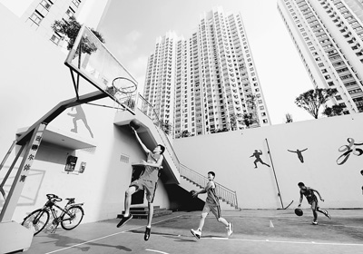圖為在山東省棗莊市,孩子們在社區(qū)籃球場打籃球。