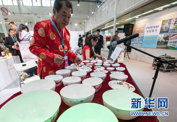參加第八屆中國北京國際文化創(chuàng)意產(chǎn)業(yè)博覽會的人員在文博會上用瓷碗演奏樂曲。新華社記者 張宇 攝