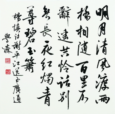 行書最能體現文人含玩生命和優游不迫的情懷,何學森的博士論文是《論行書的形成與風格演變》,其書法創作也于行書用功最深。何學森的行書,由王羲之入門,得俊拔流逸之趣,又浸淫于王獻之手札之中,玩味其尚奇之態。最近幾年,何學森又游心耽玩米芾之爽健奇逸、黃庭堅之開張縱橫,輔以蘇軾的篤實厚重,逐漸形成了醇厚儒雅、俊拔瀟灑的自家風貌。何學森的草書筑基于懷素,線條圓渾遒厚,筆跡流轉自如,毫無浮怯之??;兼收黃庭堅草書結體的奇崛多變和線條的蕩漾走筆,胎息其氣脈流宕而汪洋恣肆。近年來,何學森的草書勇猛精進,氣象逐漸開張,筆跡日趨老辣,倘輔以墨色變化,必臻新境。