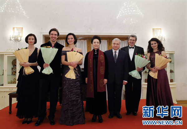 11月19日,國家主席習近平夫人彭麗媛應邀出席在俄羅斯駐華使館舉行的紀念柴可夫斯基俄羅斯歌劇晚會。這是演出結束后,彭麗媛同俄羅斯歌唱家合影。新華社記者蘭紅光攝