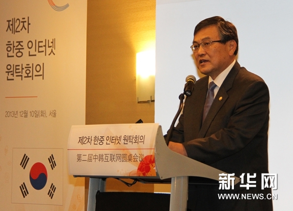 第二屆中韓互聯(lián)網(wǎng)圓桌會(huì)議10日在韓國(guó)首爾舉行,會(huì)議以“互聯(lián)網(wǎng)的發(fā)展與安全”為主題,匯集了中韓兩國(guó)政府部門(mén)、行業(yè)組織、知名互聯(lián)網(wǎng)企業(yè)和學(xué)術(shù)機(jī)構(gòu)等近百位代表參與討論。中國(guó)國(guó)家互聯(lián)網(wǎng)信息辦公室主任魯煒、韓國(guó)未來(lái)創(chuàng)造科學(xué)部部長(zhǎng)崔文基出席會(huì)議并作主旨演講。 圖為12月10日,韓國(guó)未來(lái)創(chuàng)造科學(xué)部部長(zhǎng)崔文基在第二屆中韓互聯(lián)網(wǎng)圓桌會(huì)議上作主旨演講。記者姚琪琳攝