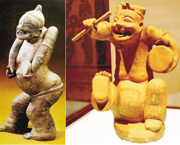 1963年,四川郫縣再次出土東漢立式說書俑。這個高66.5厘米的泥質紅陶俑,赤裸上身和雙足,縮頸扭腰,左手捏鼓,右手握槌,似正敲鼓,雙眼瞇歪,大嘴齜咧,一臉滑稽,圓肚前撅,臀部后翹,表情豐富,姿態幽默,表演生動,體態夸張,十分突出地表現出鼓書藝人的精彩演出。這件立式表演鼓書藝人俑和前述坐式表演鼓書藝人俑,珠聯璧合,相映成輝,雙峰并峙,把鼓書表演的精彩瞬間永遠地定格為中國藝術的里程碑和紀念碑,使中國曲藝彪炳千秋。