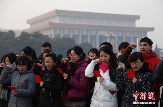 12月25日,北京大學生在瞻仰完毛主席紀念堂之后重溫入黨誓詞。 中新社發 劉關關 攝