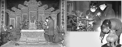 在這難得的日子,太和殿得以“享受”專業的保養和清潔。從地面的“金磚”到金漆雕龍寶座再到琺瑯仙鶴,以往,工作人員只能利用開館前的短暫時間進行清潔和保養,難以達到預期的效果。現在,他們可以從容細致地打理。金漆雕龍寶座采用透雕工藝,雕刻精致,九條龍造型復雜,龍身轉折部位以及龍鱗、龍須等部位不易操作,工作人員使用軟毛刷和吸塵器將表面塵土去除,在部分角落使用棉簽去除塵土,讓“龍椅”恢復其金光燦燦的原貌。