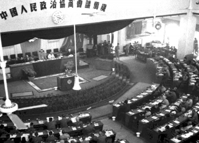 1949年9月21日至30日,中國人民政治協商會議第一屆全體會議在北平中南海召開。這次會議選舉產生了中華人民共和國中央人民政府委員會,宣告了中華人民共和國的成立;通過了具有臨時憲法性質的共同綱領和政協組織法、中央人民政府組織法;作出了關于中華人民共和國國都、國旗、國歌、紀年四個重要決議。這次會議勝利完成了創建新中國的歷史使命,開辟了中國歷史的新紀元,也標志著中國共產黨領導的多黨合作和政治協商制度的正式確立。圖為大會會場。 資料照片