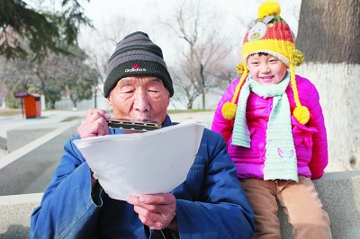 西安市興慶宮公園內(nèi),80歲的張大爺在吹口琴,吸引了一位“小知音”傾聽。魏永賢攝/CFP
