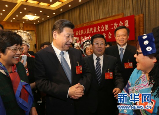 3月7日,中共中央總書記、國家主席、中央軍委主席習近平參加十二屆全國人大二次會議貴州代表團的審議。這是習近平來到女代表中間,同她們親切交流,并表示,明天就是國際勞動婦女節,借此機會,代表黨中央、國務院,向女代表、女委員及全國各界婦女同胞,致以節日的問候。新華社記者劉衛兵攝