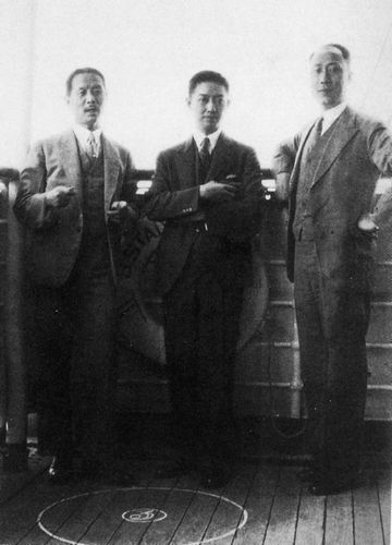 齊如山(左)與梅蘭芳(中)、張彭春(右)在赴美的船上