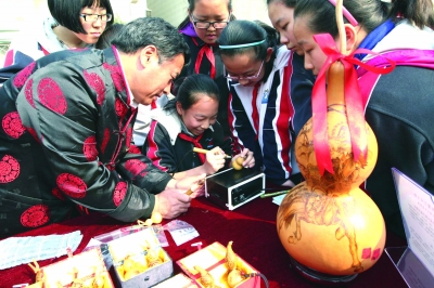 4月17日,北京市東直門(mén)中學(xué)舉辦首屆“傳統(tǒng)文化校園日”活動(dòng),校方請(qǐng)來(lái)的北京民間技藝師傅向?qū)W生們展示了雕漆、料器、泥塑、糖畫(huà)等的制作技藝。圖為民間技藝師傅在指導(dǎo)中學(xué)生制作葫蘆烙畫(huà)。