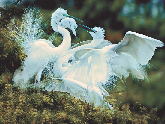 我一直對生態攝影情有獨鐘。多年來,我系統地拍過白鷺繁衍生息的過程,鴛鴦戲水逐波的歡快,天鵝遷徙生存的艱辛,還有許多野生鳥類的生活瞬間。其中有具象的寫實,也有靈動的寫意。就如中國書法有楷書和草書,中國畫有工筆畫和寫意畫。運用寫實手法表現的鳥類作品就如同楷書字和工筆畫一樣,真實清晰,具象逼真,讓人一目了然。而運用多重曝光和慢門拍攝的鳥類作品,就如草書字和寫意畫一樣,有虛有實,若隱若現,韻味無窮,具有神秘、虛幻、抽象的空靈感,引人無限遐思。在重復的疊影和曼妙的虛影中,人們能夠體會到白鷺清新豪爽,家庭和睦的情感;領略到鴛鴦淡定閑適,優雅活潑的身姿;感受到天鵝雍容華貴,志在藍天的芳儀。技術之外,我也盡可能地以人性化的方式去表現它們,賦予它們深刻的人文精神,進而喚起人們關愛生態,呵護地球精靈的高尚意識。
