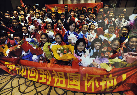 “科學發展 成就輝煌”圖片展·外交部分·2011年2月1日,滯留埃及開羅機場的廣州東川路小學管樂團46名師生安全返回廣州。