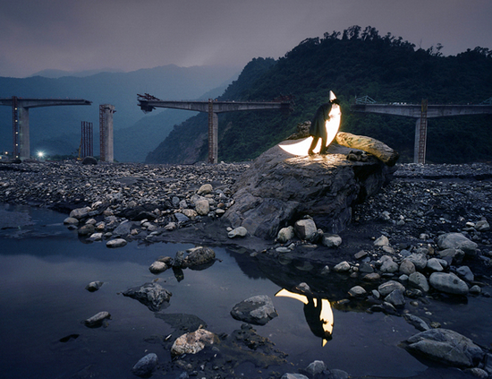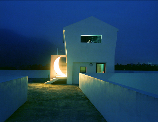 在這個系列裝置藝術作品中,他使用LED技術制作了巨型彎月,在夜晚發出明亮而均勻的光芒,創造和照亮了一個個充滿著夢幻色彩的場景。他們利用這一系列名為私人月亮(Private Moon)作品講述了一個故事:一個男人偶然間發現了月亮 ,一見鐘情,并最終如影隨行、與她共度余生。這儼然是一個荒誕不經的童話,但漂亮的視覺效果中也突顯出神秘、浪漫的氣氛。
