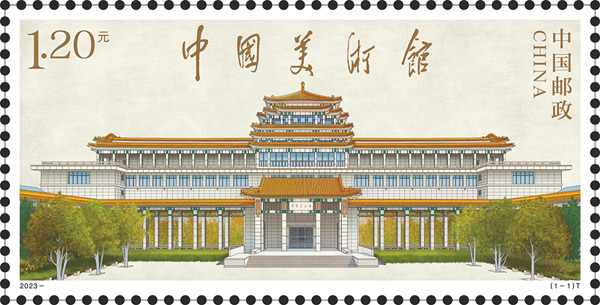 5月23日,在中國(guó)美術(shù)館建館60周年之際,由中國(guó)郵政發(fā)行的《中國(guó)美術(shù)館》特種郵票首發(fā)儀式在中國(guó)美術(shù)館舉行。郵票畫(huà)面以中國(guó)美術(shù)館主體建筑為表現(xiàn)元素,畫(huà)面雅致、主題突出,展現(xiàn)出美術(shù)館濃郁的民族特色和東方傳統(tǒng)文化韻味。郵票采用雙色雕刻,其中“中國(guó)美術(shù)館”文字和郵票面值為雕刻金制作,建筑主體采用雕刻黑線(xiàn)描摹,在紫光燈下可以觀察到版張下方的中國(guó)美術(shù)館60周年標(biāo)識(shí)發(fā)出明亮的橘色光芒。