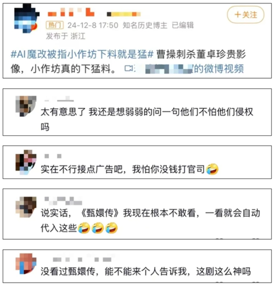 這些短視頻在博得網友一樂的同時,也收獲了不少粉絲。據媒體報道,有的自媒體,用AI做了42個“魔改”《甄嬛傳》的視頻,捕獲了18萬粉絲;某平臺上的一個“魔改”《甄嬛傳》短視頻,獲得點贊26.3萬、轉發56.4萬,視頻還插入了廣告;在“魔改”熱度的推動下,平臺上也出現了大量如何用AI“魔改”影視作品的教程。